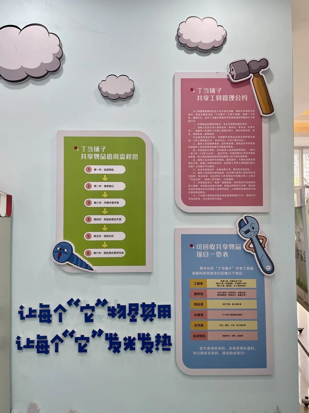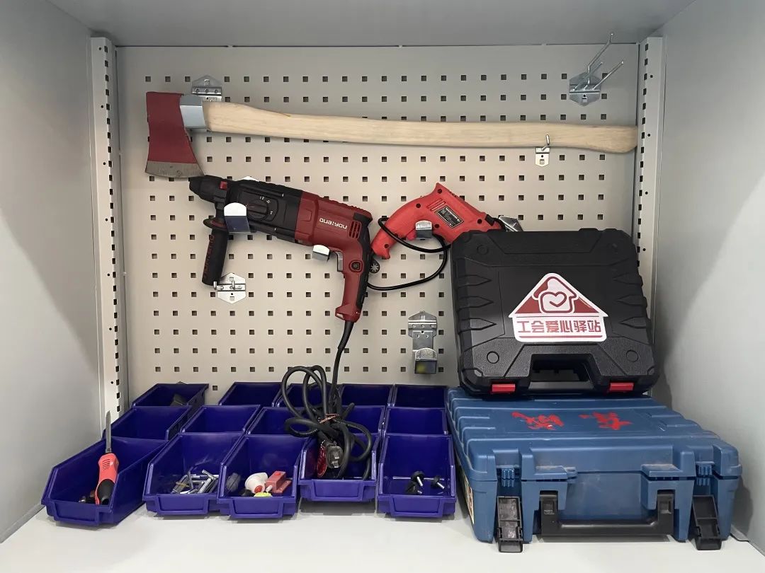 青年社区党委书记宋慧君告诉记者,过去经常有居民把梯子、打气筒、小拖车等闲置物品堆放在楼道,影响通行也存在安全隐患;另一方面,也有居民因家中需要“小修小补”,却苦于没有工具而束手无策。