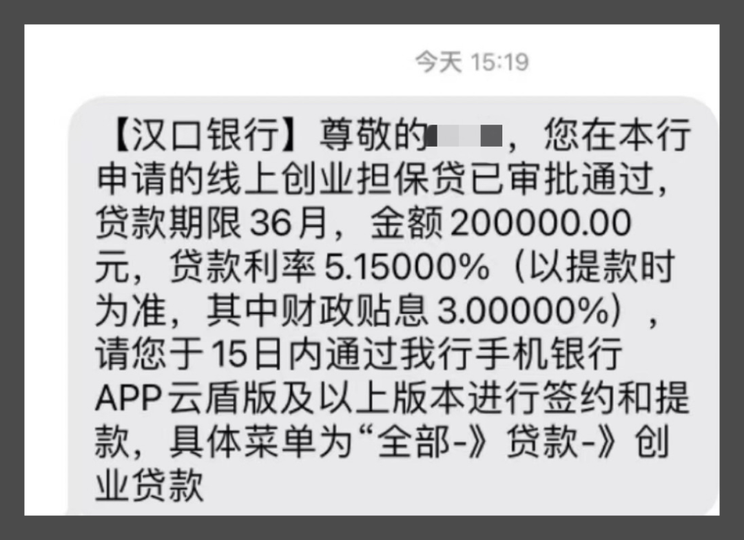 “您在本行申请的线上创业担保贷已审批通过,贷款期限36月,贷款利率5.15%(其中财政贴息3.00%)......”伴随着“叮咚!”声,江汉区创业青年95后胡先生收到了翘首以盼的短信,他感叹“这个创业贷太给力了,我从申请创业资格到银行放款都全部在手机上操作,政府还给了这么大力度的贴息,实在是既方便又实惠!”