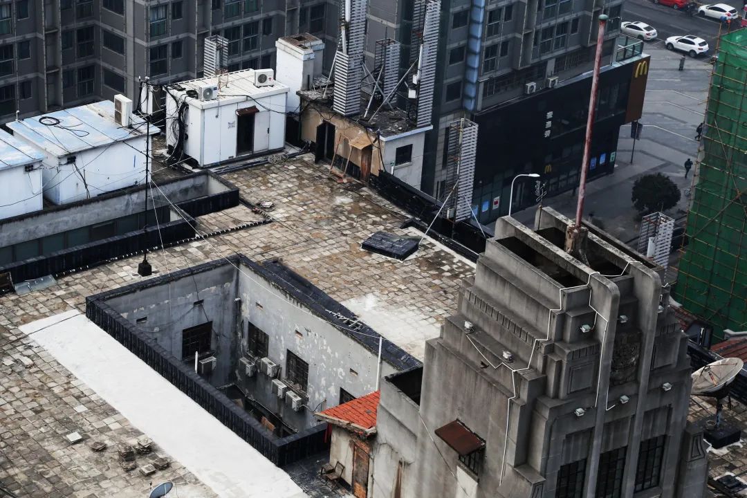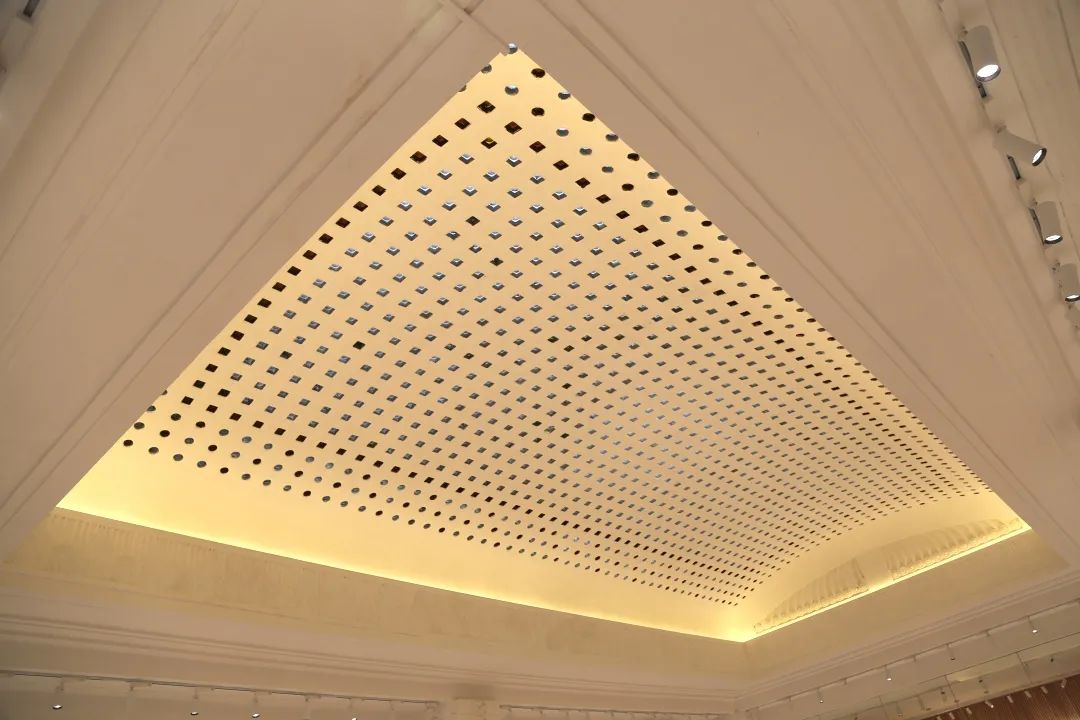 行至高处,映入眼帘的除却错落的几何层高,便是银行大楼乾坤暗藏的天井结构。与二层的镂空天花板两相结合,不难想象到当年,天气晴好时便有阳光直射而下,透过镂空的小孔,将斑驳的光影泼洒在银行大厅内,人群熙熙攘攘、银钱进进出出,那一派繁荣景象。