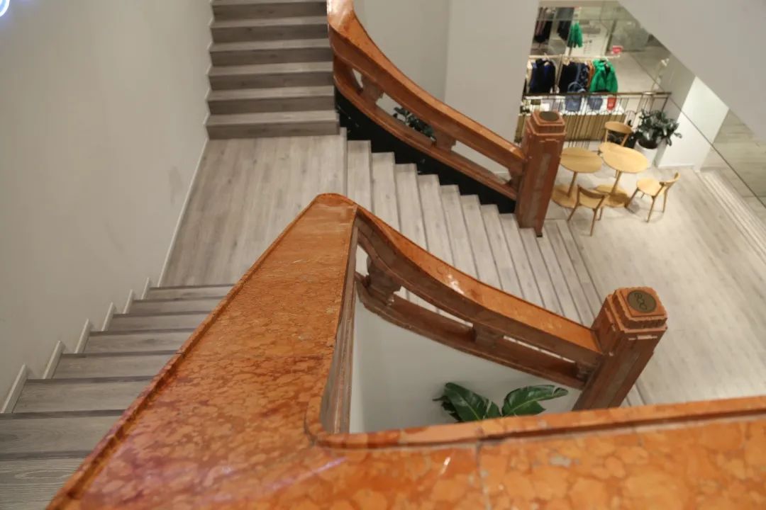 推开厚重的门扉,昔日的银行大厅已变作精美的商品店,从前地下一层的金库大门卸下重担,悠闲立于商店一隅的玻璃橱窗中,迎着顾客或游人好奇的打量和追思。店内林立的货架尽头处有一个旋转扶梯,从它装饰一新的外表虽看不出分毫,结构却是当年的设计。沿着阶梯拾级而上,抬头看向挑空的二层天花板,外沿饰以简洁的几何雕刻,中部大片的曲面镂空小孔,让人想再往上去探个究竟。