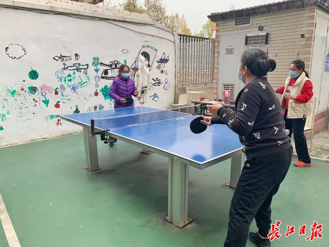 居民在小区里切磋乒乓球,墙上的壁画也是由居民自己创作。