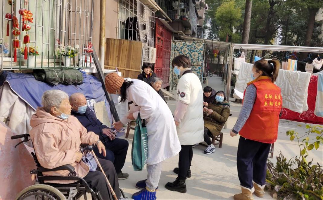 同日,汉兴街道新湾社区两委、网格员及卫生服务中心的医护人员也组成了健康服务队,来到老旧小区——牛奶场宿舍,为小区的老年人们做健康情况检测。