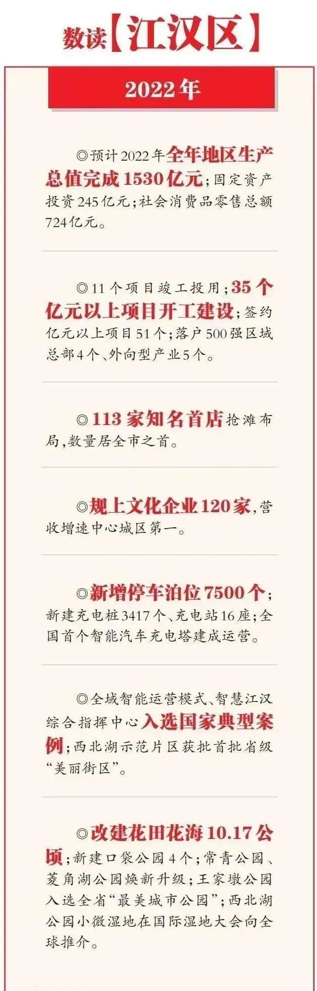 一面,传统商贸业、金融业的稳步增长;一面,加速“数字化转型”、推动战略性新兴产业融合集群发展。当前,江汉区突出“厚植优势,补齐短板,精明增长,品质发展”,努力建设富裕活力美丽幸福的社会主义现代化卓越城区。