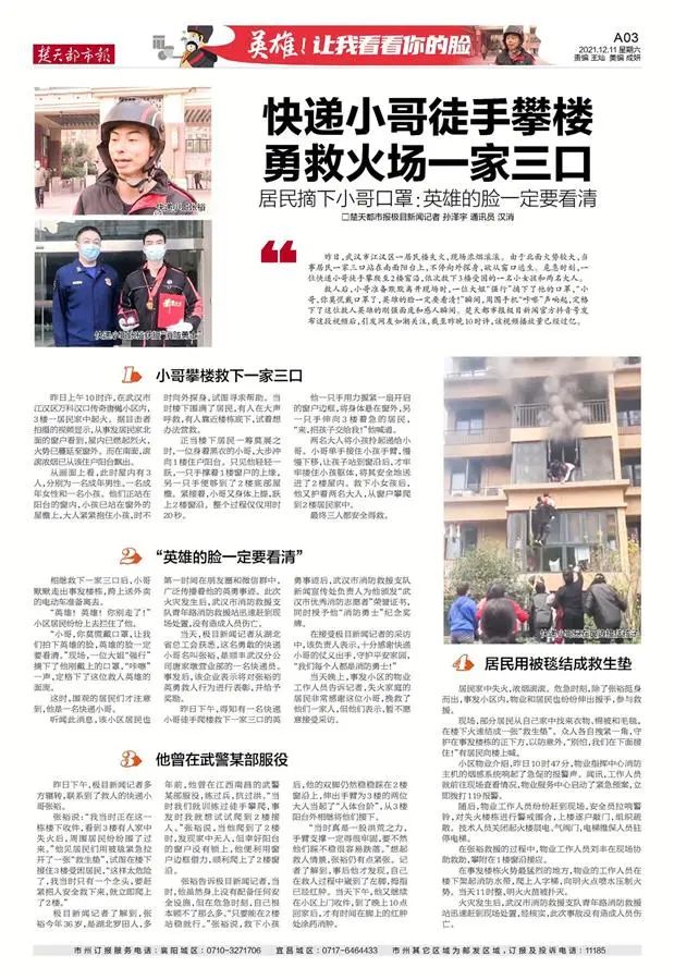 2021年12月10日11时许,武汉市江汉区某小区一栋住宅楼3楼起火,一家三口被困阳台,火势凶猛。危急关头,正在小区揽件的张裕看到后,毫不犹豫冲上前,他徒手爬上二楼,稳稳将被困的小女孩救下,随后又帮助两名大人脱险,成功营救三人。