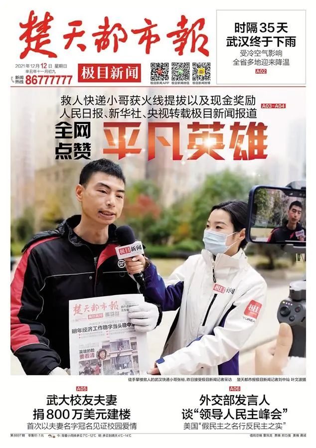 救人后的他打算低调离开,却被小区居民拦住扯下口罩:“英雄,让我看看你的脸!”事发后,楚天都市报极目新闻推出全媒体报道,其中抖音平台原创短视频总播放量高达4.2亿次。中央、省市近百家媒体聚焦报道,全国亿万网友留言点赞:“平凡小哥是真英雄!”