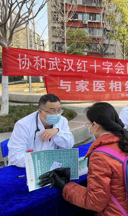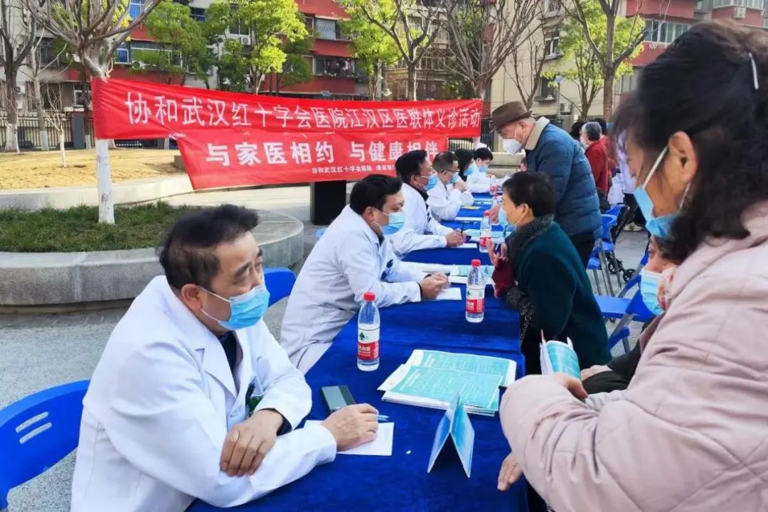 2月20日上午,协和武汉红十字会医院在唐家墩街社区卫生服务中心门口小花园内开展江汉区医联体义诊活动,与唐家墩街社区卫生服务中心联合举办“与家医相约,与健康相伴”活动。