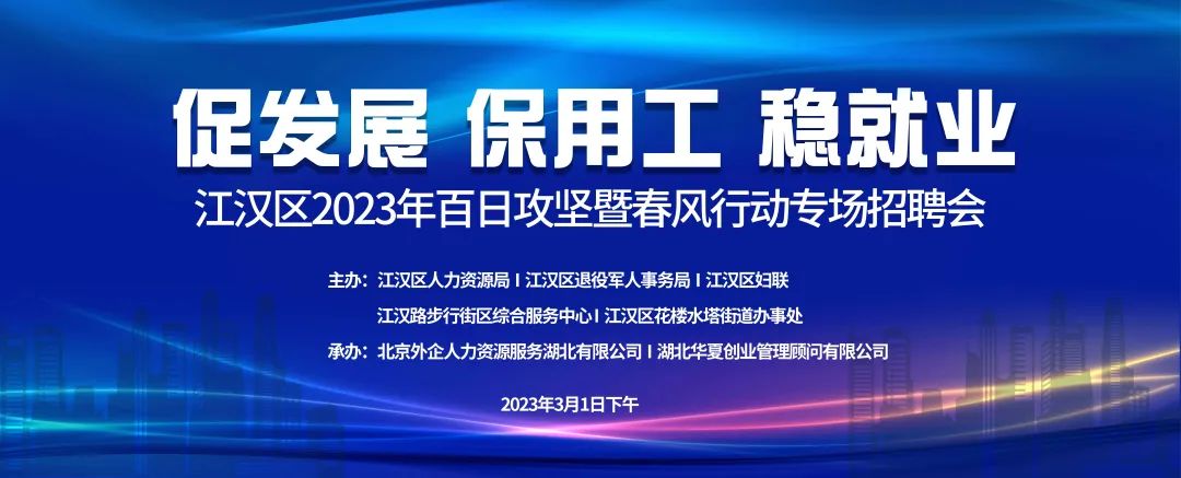 3月1日下午2:30—5:30,让我们就在这“尖板眼”的江汉路步行街——地铁2号线江汉路站C出口三联书店前小广场,来一场无与伦比的邂逅,相约江汉区2023年“百日攻坚暨春风行动”大型专场招聘会。