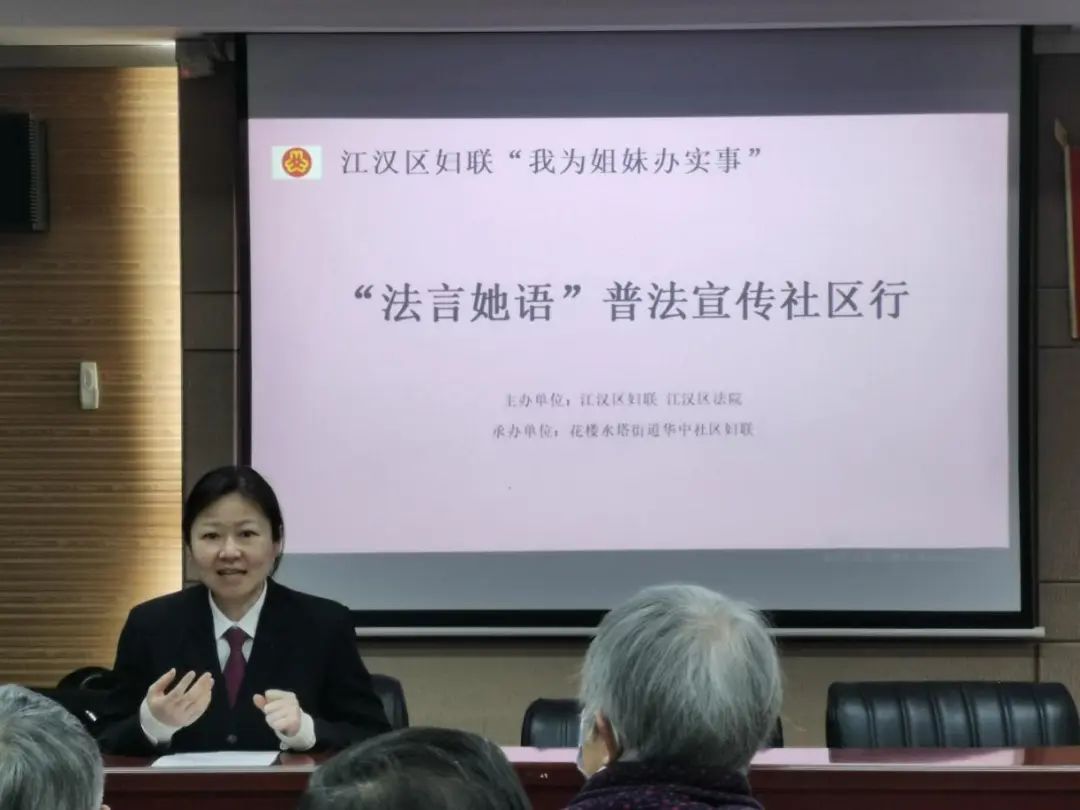区法院民一庭法官魏晋在花楼水塔街华中社区的首场讲座中以《情法交融,解开家长里短结》,从“一份人身保护令、一份离婚证明书、一份家庭教育令、一份赡养指导令”入手宣讲家事法律知识,零距离释法明理,让妇女群众感受到法律服务就在身边。