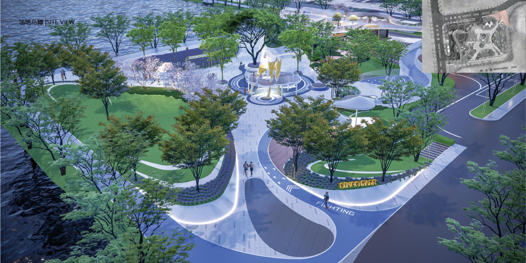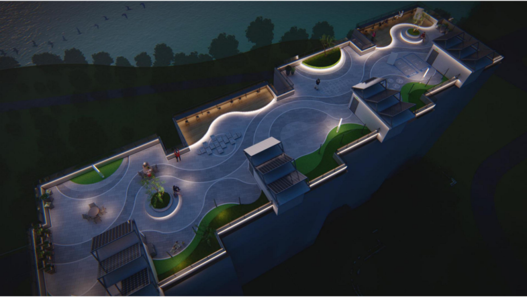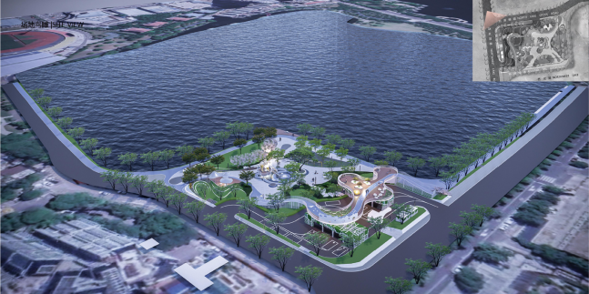 地上变为集绿地跑道、儿童乐园、观景平台等为一体的生态小游园。小游园分为上下两层,一层设置健身休闲区、儿童游乐场、水吧、临湖平台等区域,二层的廊架则可以让市民、游客远眺湖面。