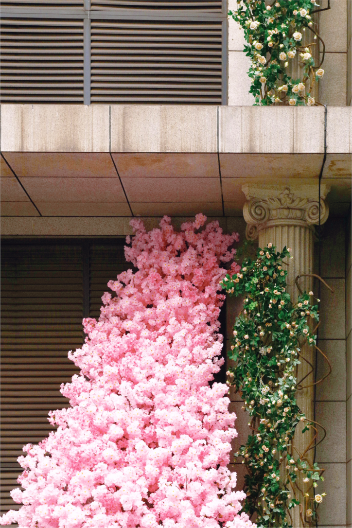 换上了一道粉红色的樱花瀑布