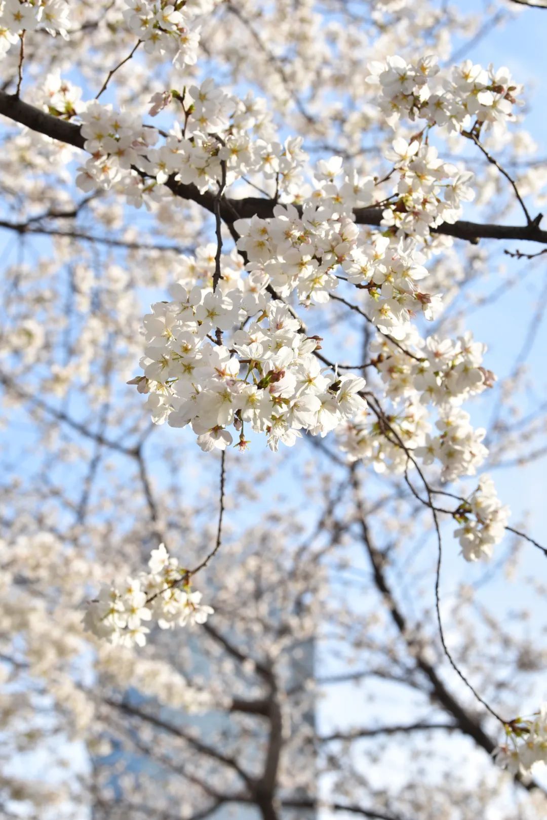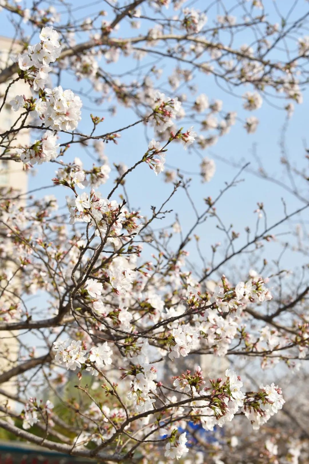 王家墩公园的樱花也在盛放中。粉白的花朵镶满枝头,成团成簇。