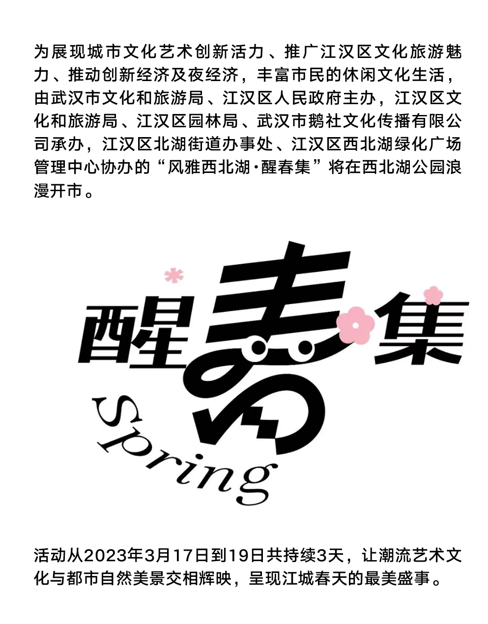 本次“风雅西北湖·醒春集”活动,正是江汉区推进文旅融合发展的一项具体举措,是武汉市“江城赏花季”的特色活动之一,是“相约春天看樱花”的江汉美丽打卡地。