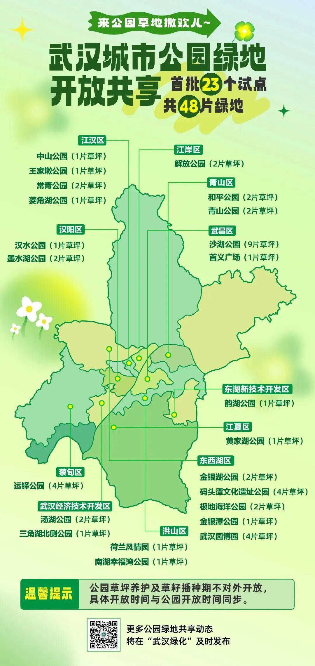 全市23个城市公园绿地共享试点,共有48片草坪,约56万平方米,将更好地满足市民游客亲近自然、休闲游憩、运动健身等新需求和新期待。其中江汉区有4个城市公园绿地对外开放,欢迎一起在江汉躺“坪”。