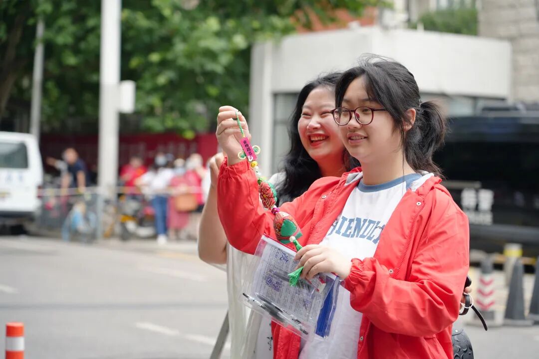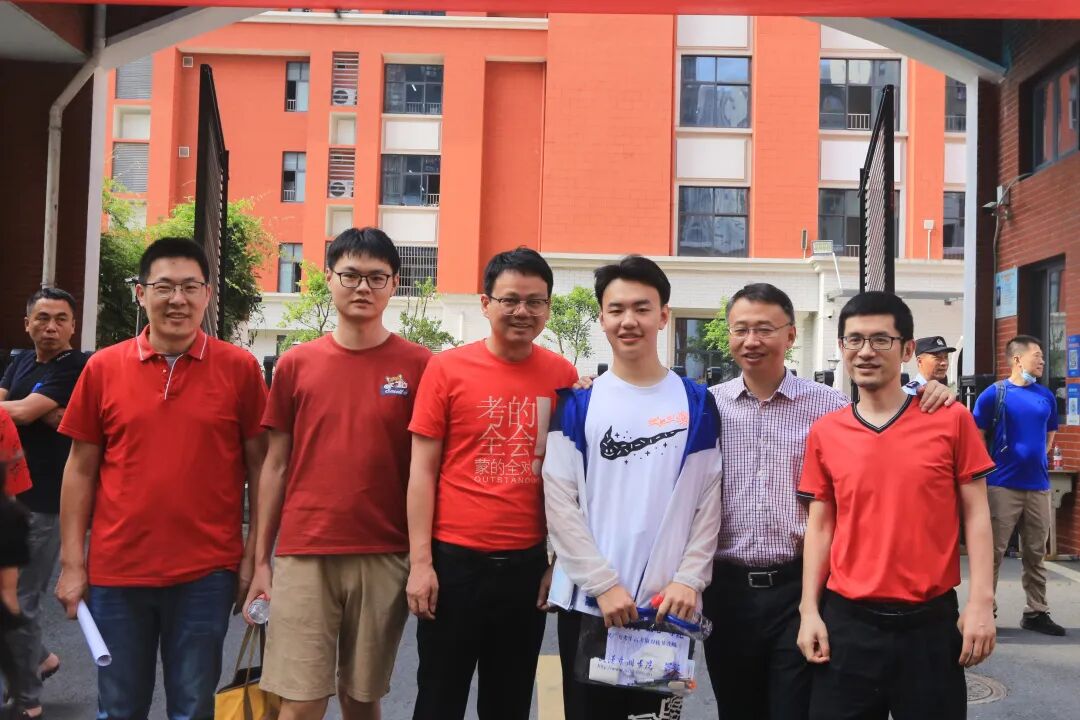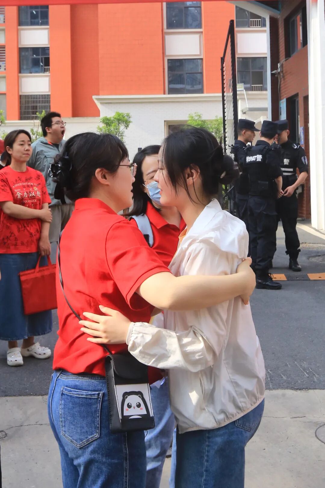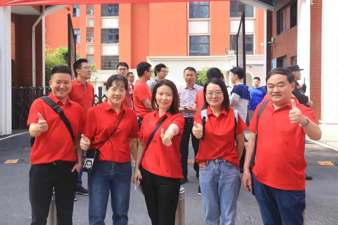 多所中学的带队老师身着红色服饰,早早等候在考点门前,为学生鼓劲加油并热情拥抱。