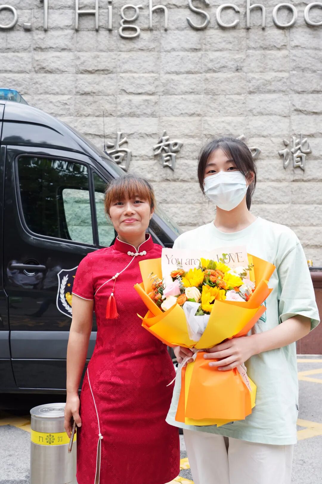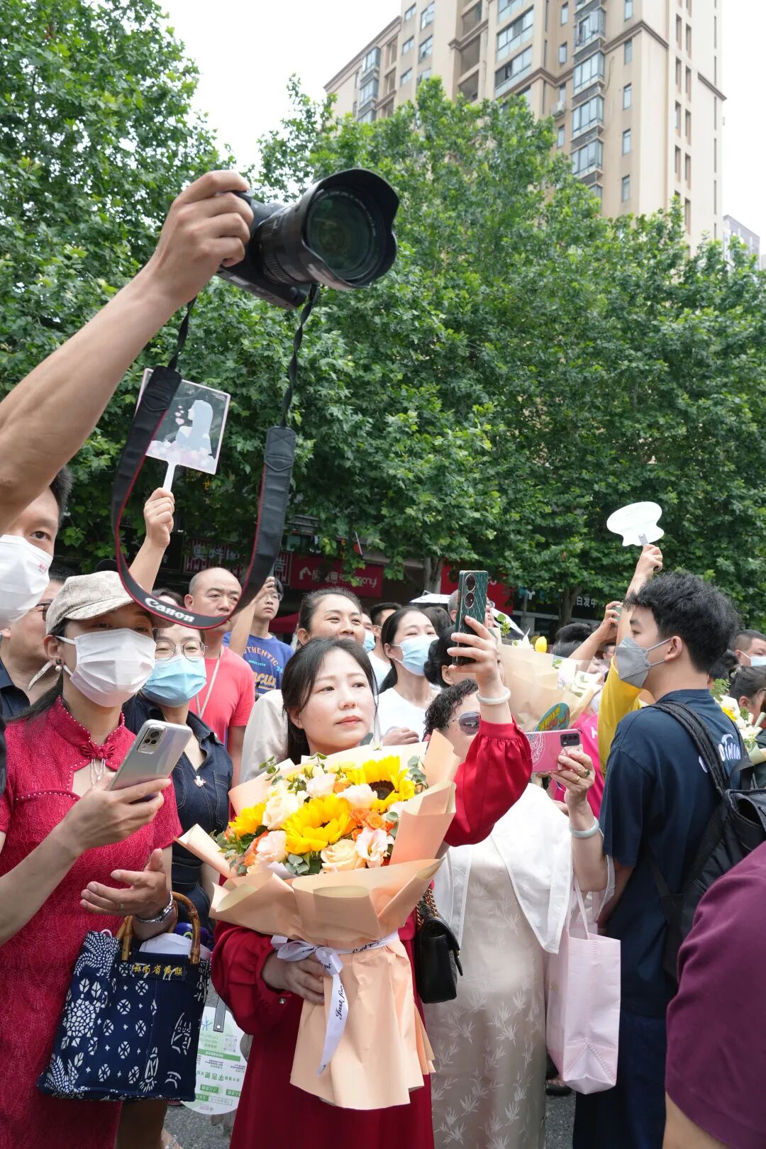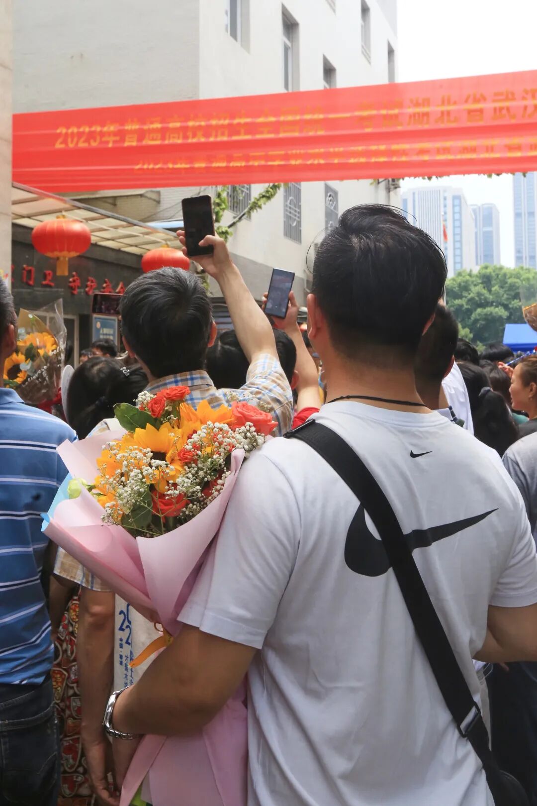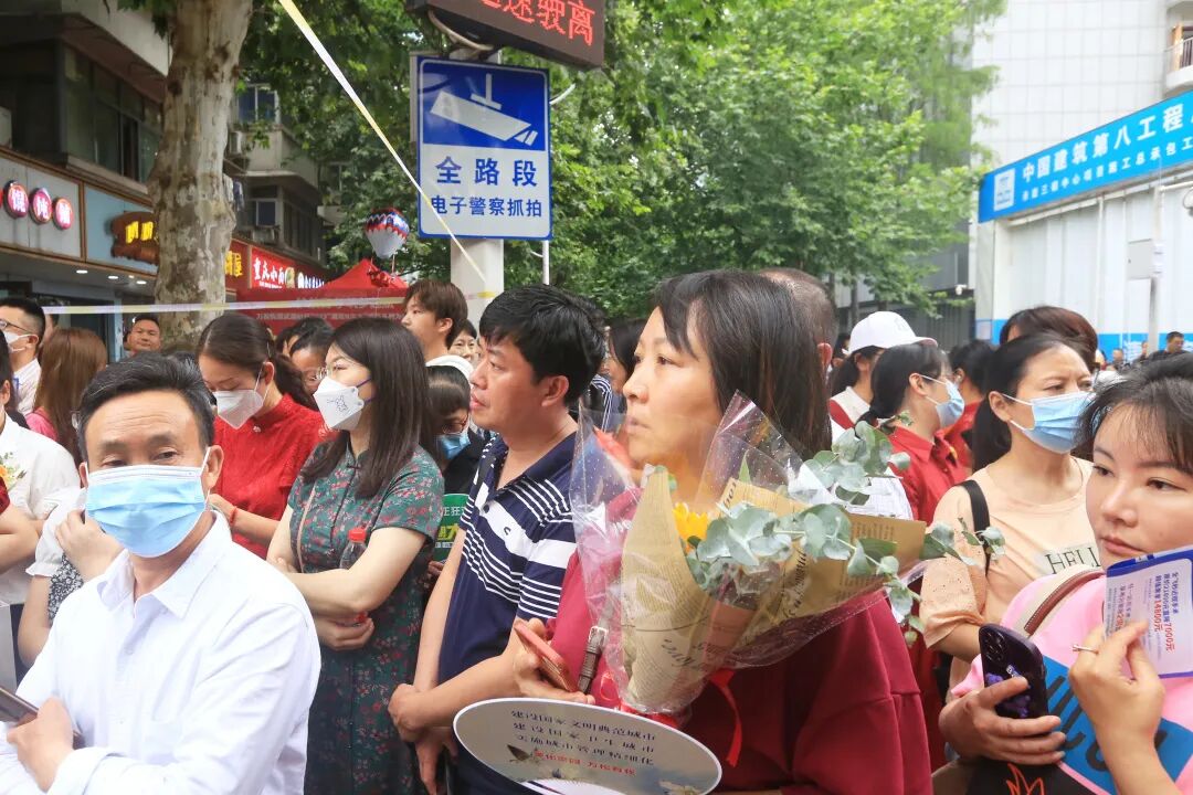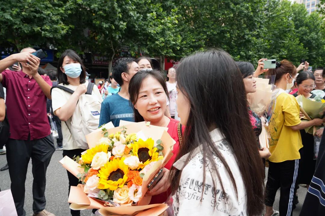 家长们手捧鲜花在考场外等候考生。