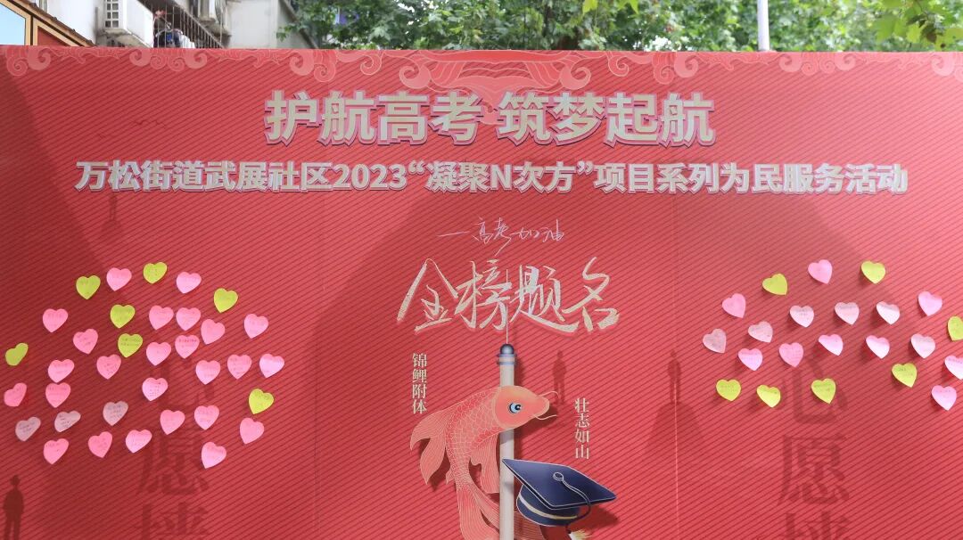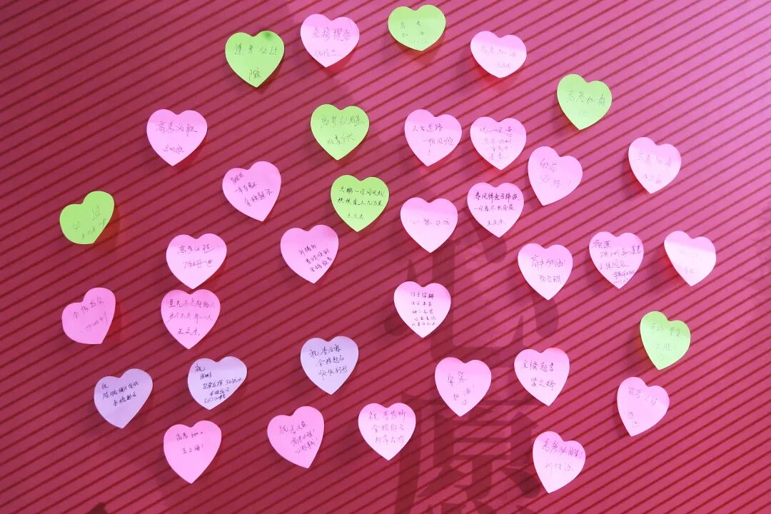 第六十八中学考点外的心愿墙上贴满了对考生们的心愿寄语。