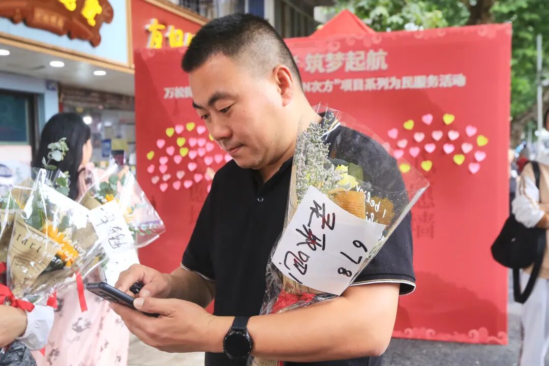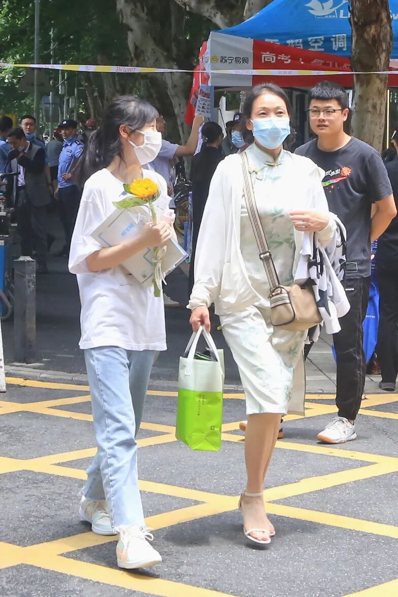 考场外,不少家长提前准备好鲜花、礼物与祝福为考生加油鼓劲。