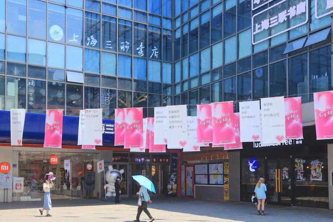 行走在江汉路,大厦蓝色玻璃幕墙上张贴着上海三联书店的logo,书香散发在城市街道之间,吸引着过往的行人。
