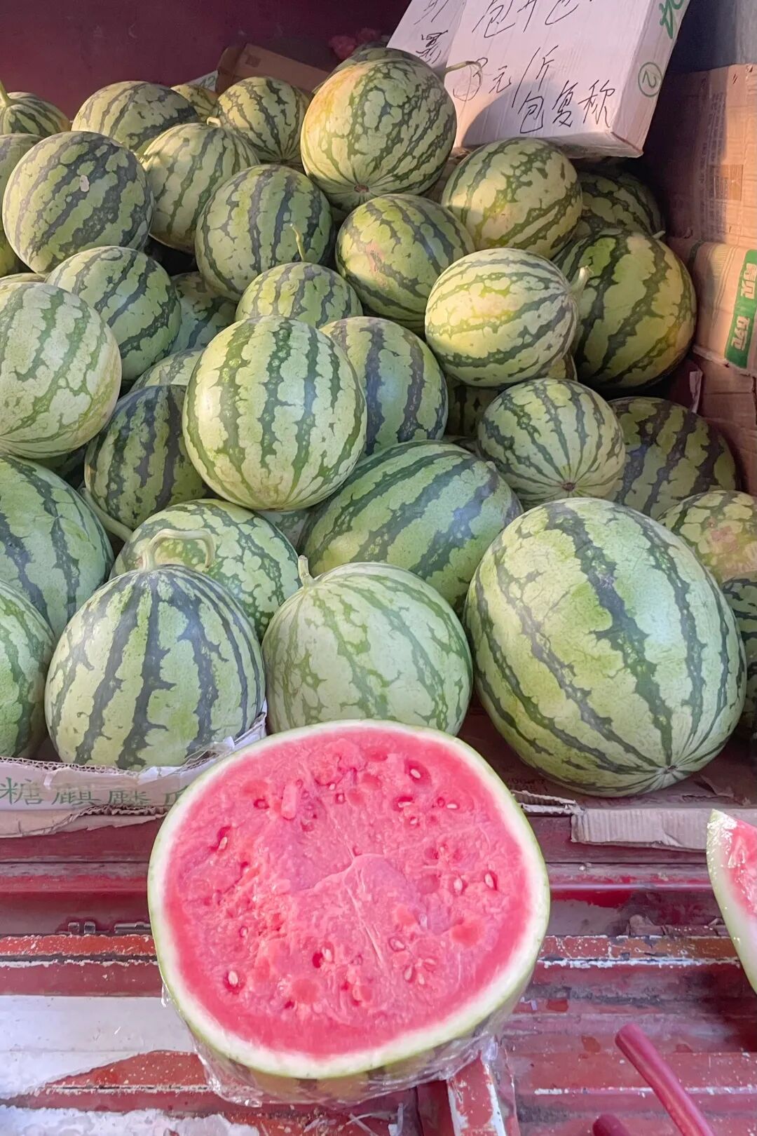 转角,遇见一辆满载西瓜的卡车,红彤彤的西瓜一下就吸引过路行人的眼球。
