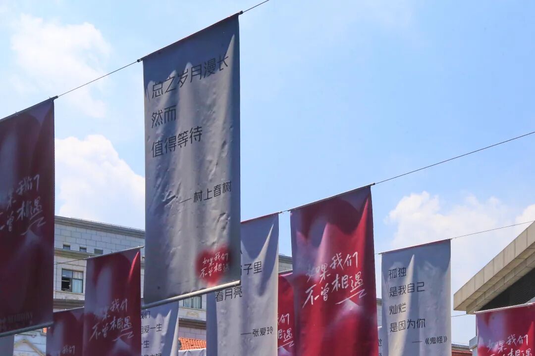 走进书店,清凉的冷气扑面而来,随之而来的还有大片醒目的蓝色标语。