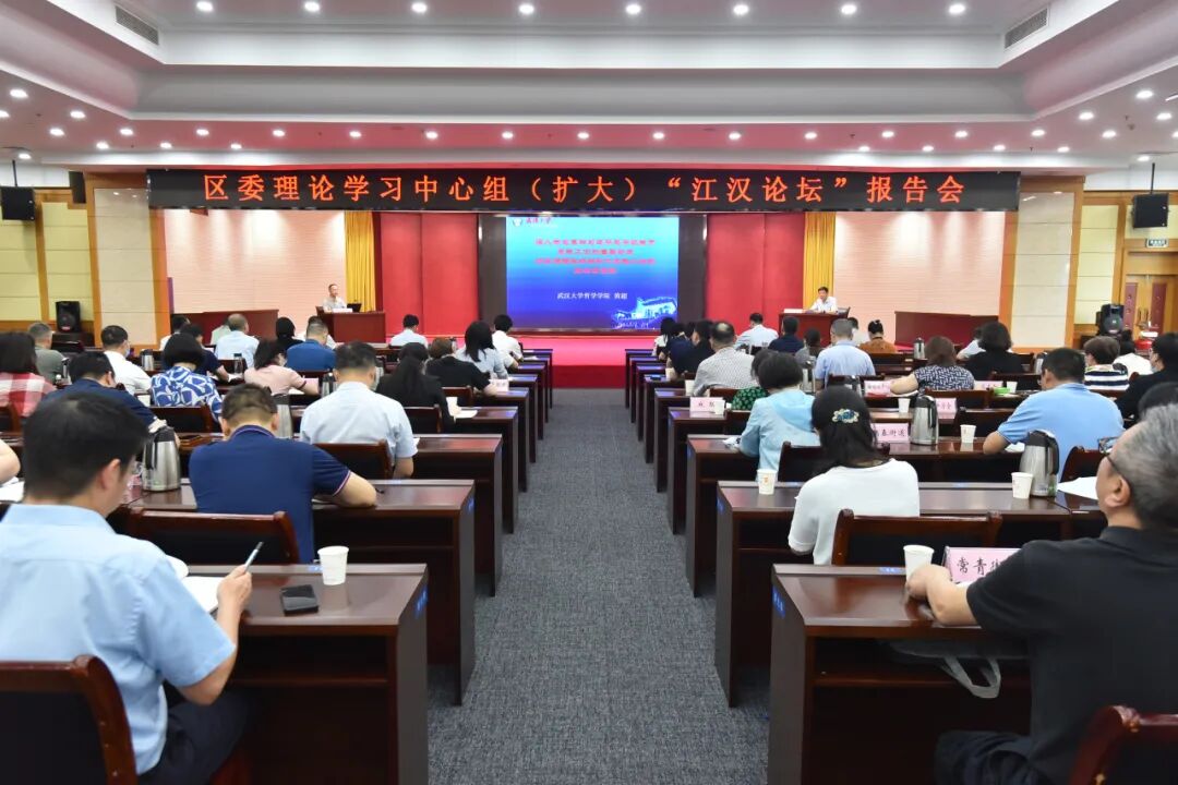 7月13日,江汉区举办区委理论学习中心组(扩大)“江汉论坛”报告会,邀请武汉大学哲学学院副院长黄超教授作新时代宗教工作专题辅导报告。区委书记李湛主持报告会。区委理论学习中心组成员,各街道各部门单位党政主要负责同志参加学习。