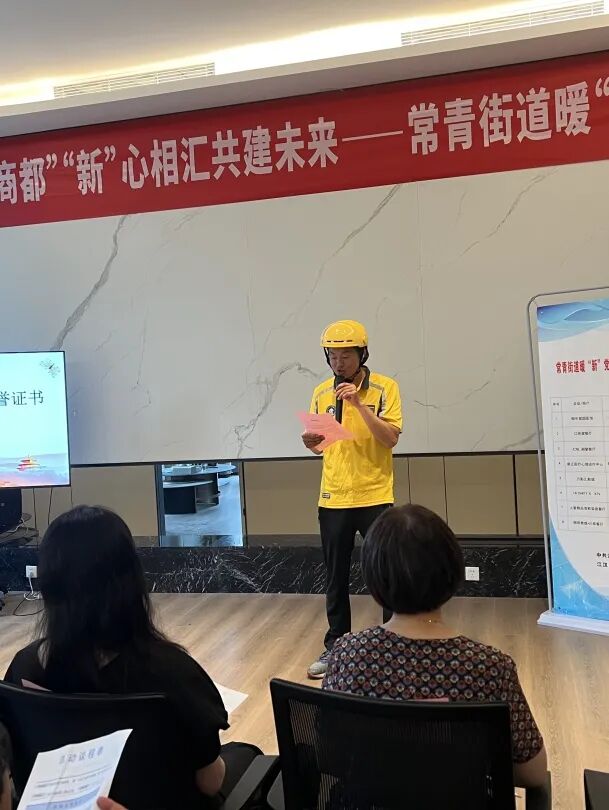 今年以来,常青街道在区委组织部的指导下,发挥辖区地理及资源优势,广泛链接群团组织、两新组织及商户资源,积极服务新就业群体,进一步扩大党在新兴领域的号召力、凝聚力和影响力。常青街道相关负责人介绍,现场成立“小哥安全巡逻志愿服务队”,充分发挥先进榜样带头作用,让“小哥们”都能加入到常青街道基层社会治理,同时鼓励辖区商户给快递小哥奉献爱心、给予帮助,让大家在常青树下,实现幸福的双向奔赴。