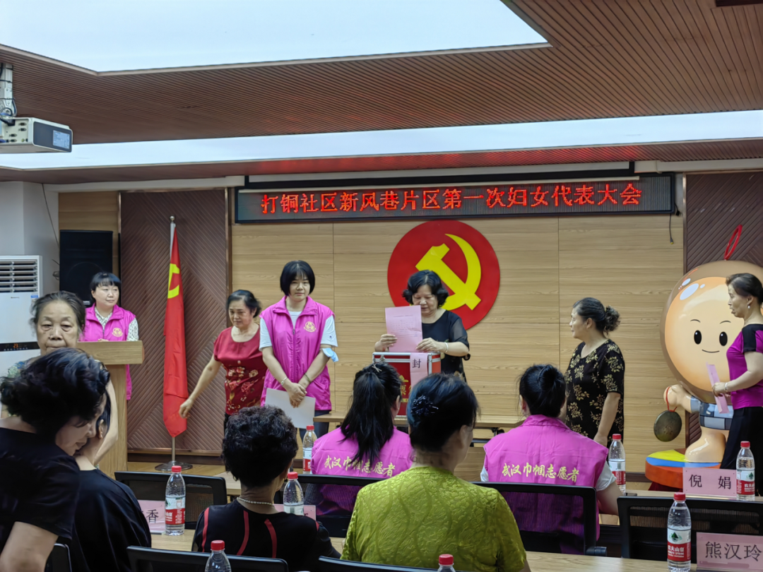 为深化群团组织改革和建设,坚持党建带妇建,把妇联组织建在家门口,实现妇女姐妹出门看得见组织、有事找得到“娘家”,在江汉区妇联指导下,7月28日下午,江汉区民权街道打铜社区新风巷片区成立了武汉市首家小区(片区)妇联组织。新风巷片区28名妇女代表参加了江汉区民权街道打铜社区新风巷片区第一次妇女代表大会。