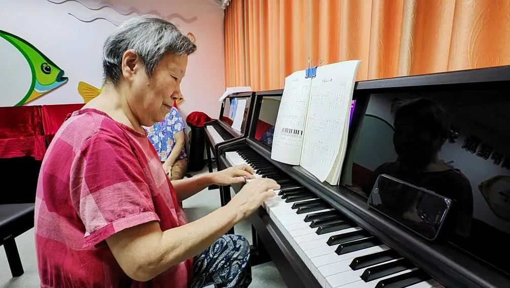 原以为是谁家小孩在练钢琴,走近一看竟是位头发花白的婆婆专注地边看乐谱边敲击琴键,调子不甚纯熟,却也有模有样了。