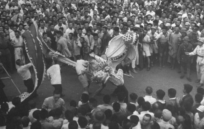 抗战胜利,民众在街头欢庆。