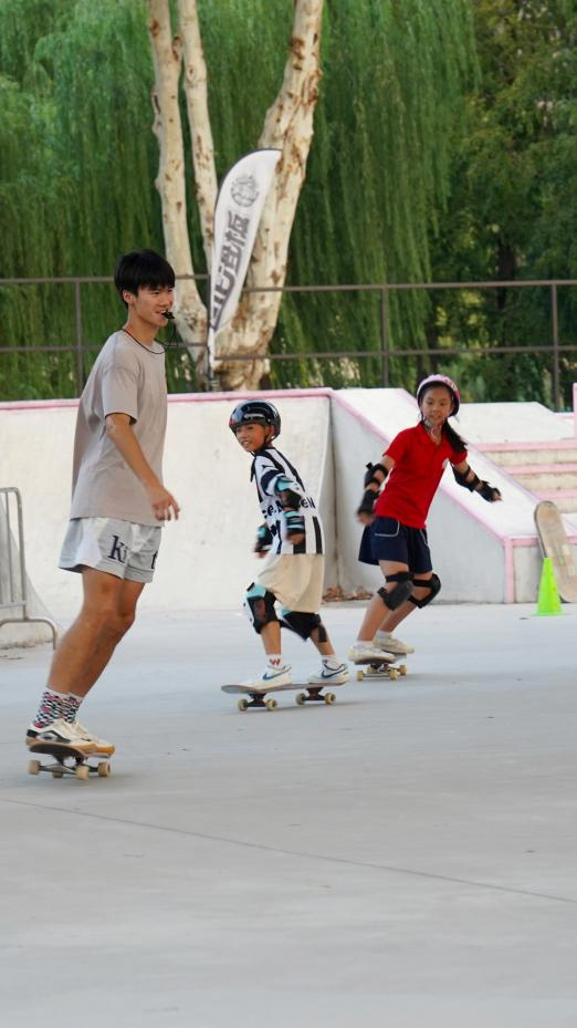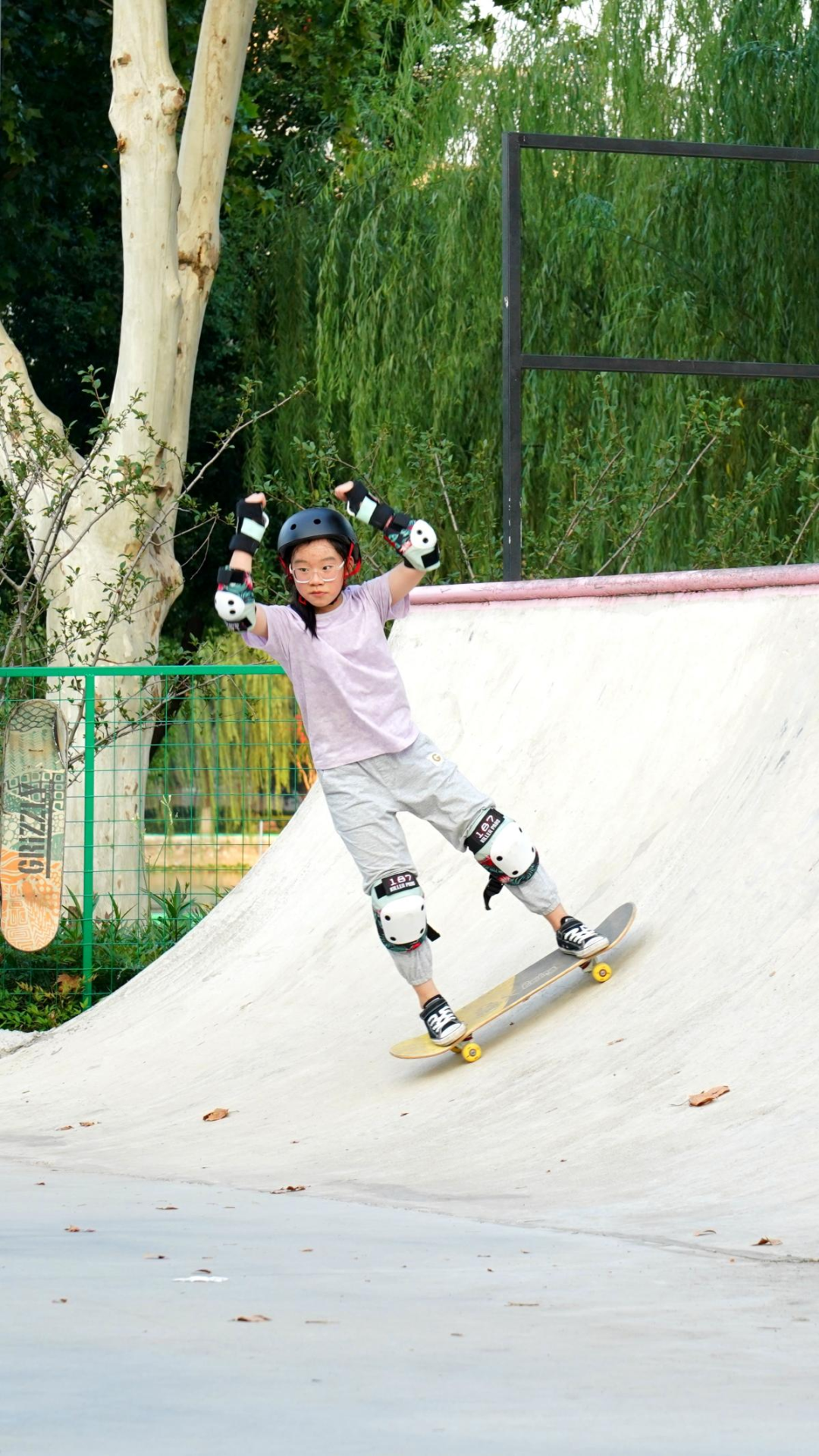 6岁的葱葱在爸爸的带领下已经是第5次来学习滑板了,小姑娘毫不怯场,跟随教练的节奏弓腰侧身,先将左脚站在滑板上前方,右脚站在地上膝盖弯曲然后用力向后一蹬,整个人就随着滑板飞快滑了出去。