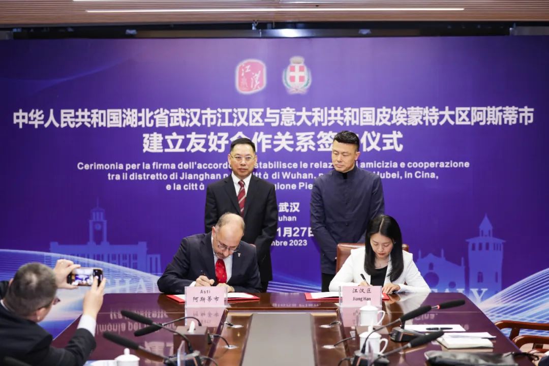 11月27日,武汉市江汉区与意大利阿斯蒂市建立友好合作关系签约仪式在汉口文体中心举行,武汉市江汉区委副书记、区人民政府区长叶文静与意大利阿斯蒂市市长毛里奇奥·拉塞罗签署建立友好合作关系备忘录。湖北省委外办副主任陈汉华、武汉市委外办副主任李军出席活动并见签。