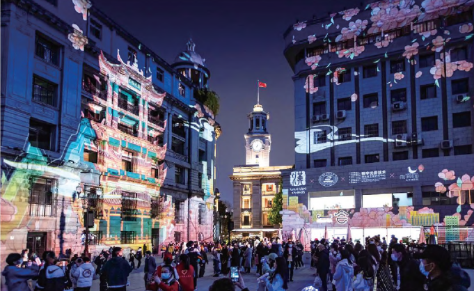 “当‘樱花’开在那片建筑上,惊艳众人,钟声响起时,对我的感官冲击力更加强烈了。”游客金先生回忆之前在江汉路看到的光影秀,他说当时的画面不看照片很难想象,但只要听到江汉关的钟声,就能瞬间让他坐上“时光机”,回到当时的场景里。故地重游,他对江汉路步行街的印象,也在钟声加持下,显得格外深刻。