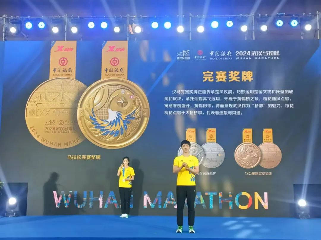 汉马完赛奖牌正面传承楚风汉韵,巧妙运用春秋战国时期的楚国文物和氏璧的轮廓和底纹,承托仙鹤高飞远翔,环绕于黄鹤楼之顶,樱花随风点缀,寓意春樱盛开,黄鹤归来;背面展现武汉作为“桥都”的魅力,武汉市花梅花点缀于大桥桥墩,代表着连接与沟通。