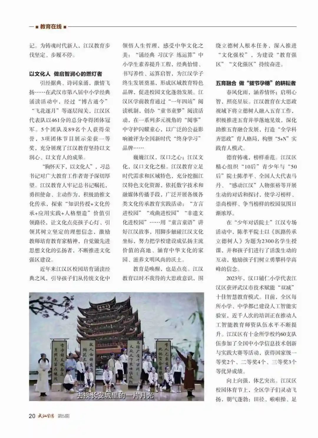 近年来江汉区校园培育诵读经典之风,引导孩子们从传统文化中领悟人生哲理,感受中华文化之美:“诵经典 习汉字 练运算”中小学生素养提升工程,经典怡情、书写养性、运算启智,为江汉学子终生发展奠基,形成区域教育特色品牌,促进校园文化蓬勃发展。江汉区学前教育通过“一年四站”阅读机制,创办“童书童梦”阅读活动,在一系列多元视角的“阅事”中守护闪耀童心,以广泛的公益影响被评为全国新时代“终身学习”品牌……