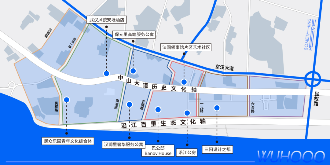 分布着江汉关大楼、璇宫饭店、中心百货、日清银行、四明银行等13栋优秀历史建筑