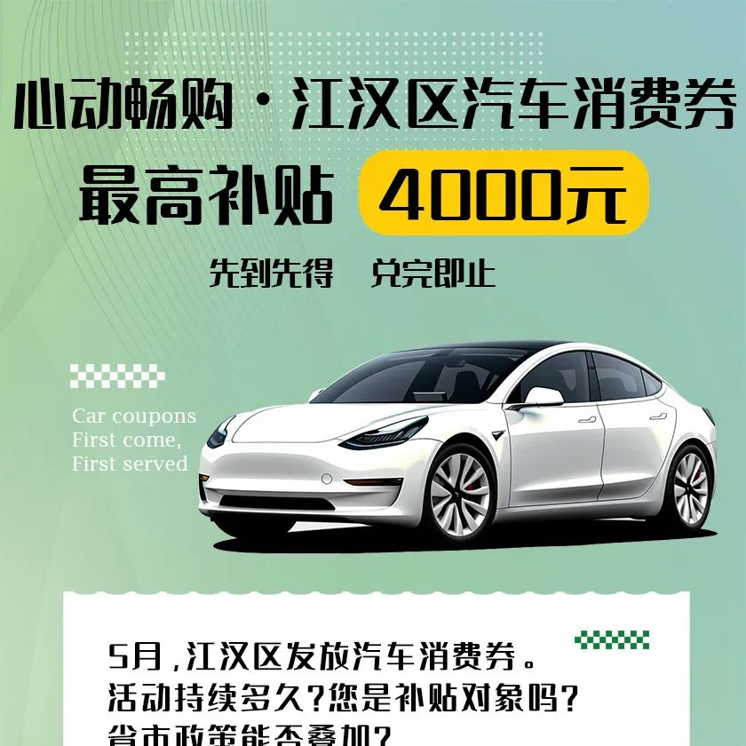 4月30日至5月29日,最高补贴4000元的江汉汽车消费券叠加省市汽车消费券、商户优惠券,让购车人士获得实惠。