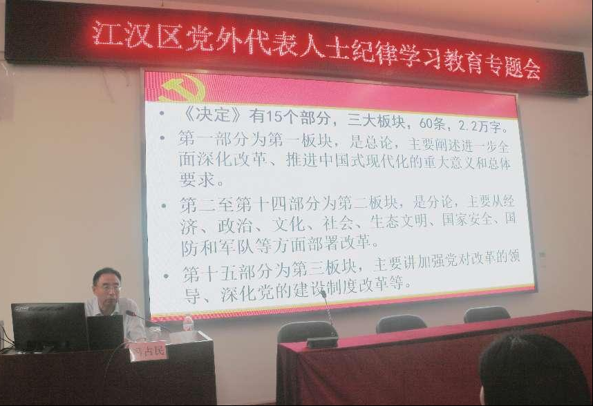 为深入学习贯彻中共二十届三中全会精神和习近平总书记关于做好新时代党的统一战线工作的重要思想,巩固拓展“凝心铸魂强根基 团结奋进新征程”主题教育成果,进一步提升全区党外代表人士履职能力水平,9月4日至6日,中共江汉区委统战部在区社会主义学校举办第32期党外代表人士培训班,全区各民主党派、知联会、新联会及区属相关单位共35名学员参加此次培训。培训在课程设置、师资选配、场地安排等方面进行了精心组织,旨在充分结合江城红色资源禀赋和科技创新优势,创新学习形式,丰富学习载体,教育引导广大党外人士感悟初心使命、激扬奋进力量。本期主题教育培训班内容丰富、亮点纷呈,一起来看看吧!