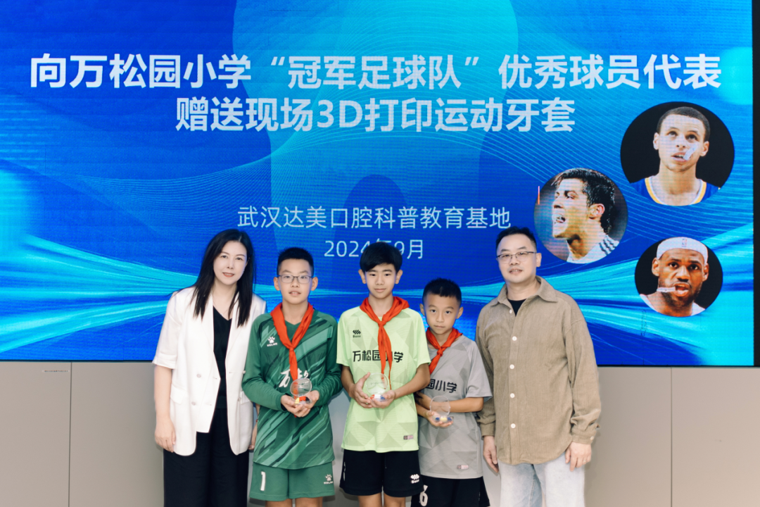 熊晖教授为万松园小学“冠军”足球队的三位小队员送上3D打印的运动保护牙套,让孩子们能在绿茵场上尽情驰骋,享受足球运动带来的快乐。