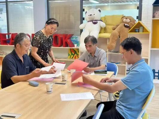 陶海生在讨论社区宣传稿件。受访者供图