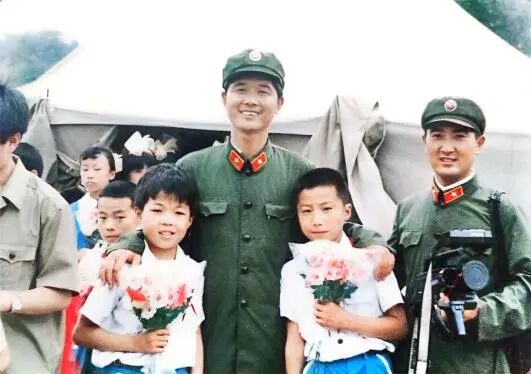 陶海生采访战地帐篷小学后与学生合影。受访者供图