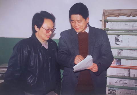 陶海生在《农民之友报》与记者研究稿件。受访者供图