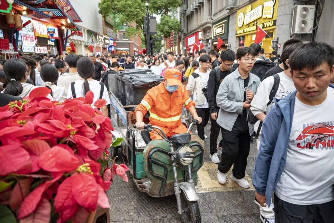 国庆假期,魅力武汉吸引了八方游客。江汉区城管执法局深耕“勤务模式”,强化一线督导,突出重点商圈、交通场站、景点景区等重点部位,以最高的管理标准和最靓丽的城市形象服务市民和游客。“烟火巷垃圾桶需要清理了”,10月4日上午11时,江汉路步行街清运班长张毅正在调度巡回收运车辆对即将装满的垃圾桶进行清收。