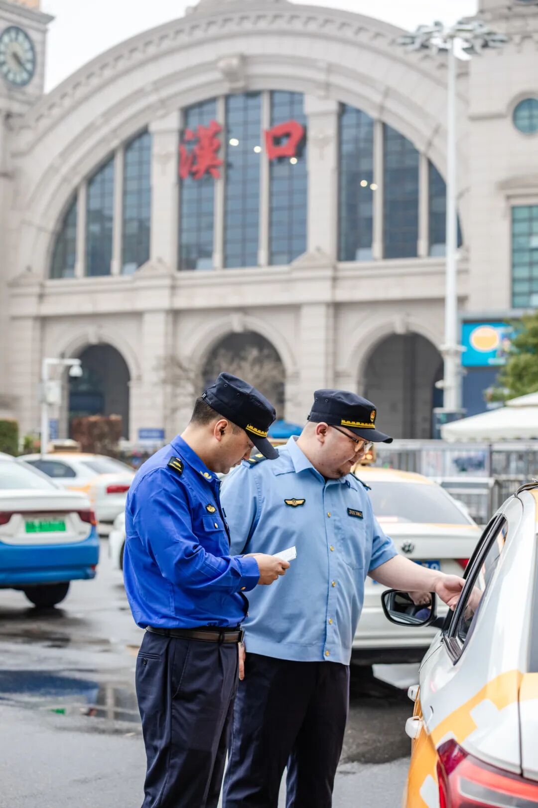 国庆期间,执法队员在早晚重点时段,加强对欧亚达广场路口,汉口火车站南广场等区域的士抽查,对站区网约车及其它社会车辆是否存在违规营运情况进行排查,同时提供热情服务,热心为游客指明道路,提供最优出行方案。