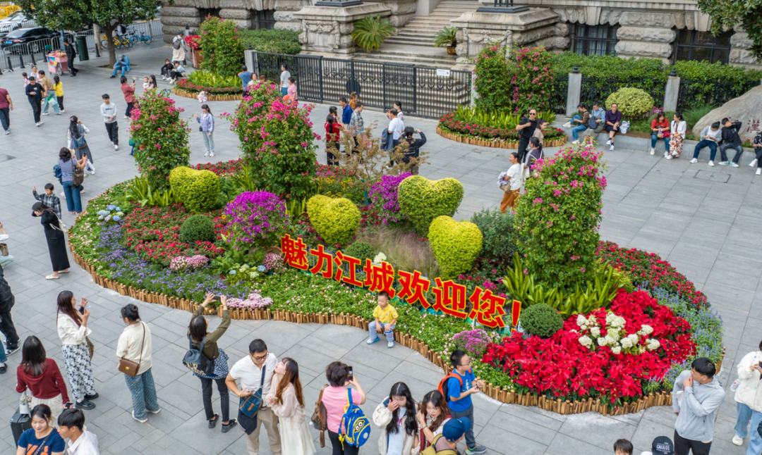 国庆期间,各大公园、景点、商圈成为市民游客休闲娱乐的首选之地,为了给市民游客营造一个安全、舒适、和谐的游玩环境,江汉区城管执法局做好国旗张挂及后期巡查维护,保持国旗悬挂规范、容貌整洁,综合实施景观亮化、园林绿化、立面美化;围绕窗口地带、热门景点和网红打卡地,精心设置主题园林小品、雕塑、扎景、立体绿化等,展现武汉独特城市魅力。