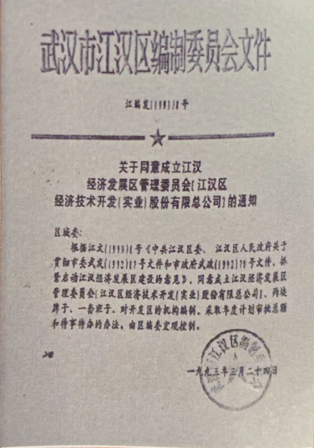 1993年,区委、区政府同意成立江汉经济发展区管理委员会和江汉区经济技术开发(实业)股份有限总公司,1994年正式动工兴建。