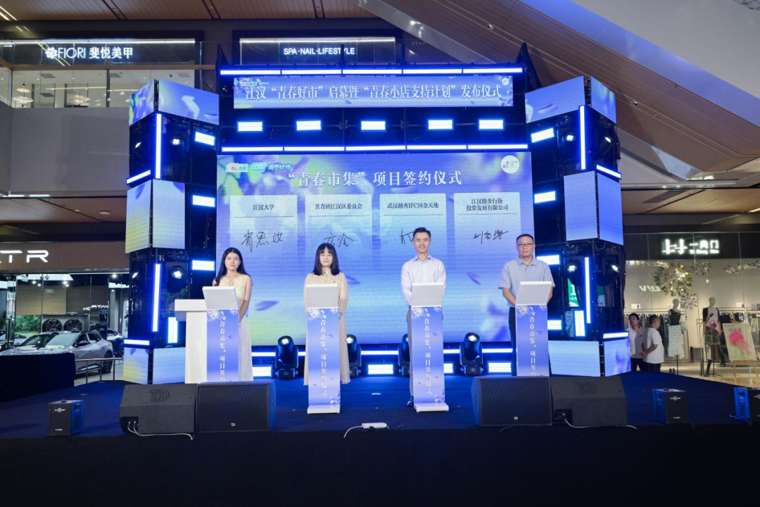 江汉团区委、江汉大学、武汉越秀IFC国金天地、江汉路步行街投资发展有限公司共同参与“青春市集”共建点位项目签约仪式,着力搭建青年创新创业一站式服务平台,营造“高校创意+市集练兵+商圈孵化”的全链条青创生态体系。