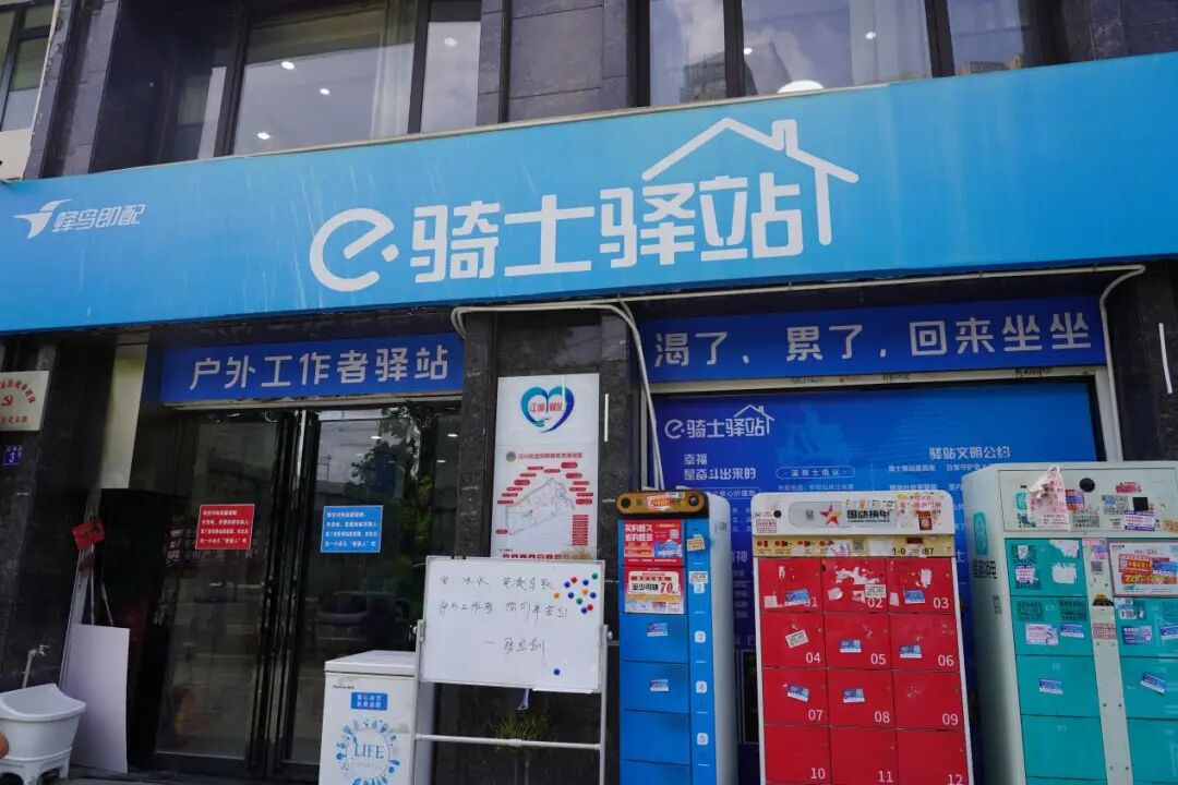 红旗渠路的饿了么蓝骑士驿站,下午三点正是最忙的间隙。外卖小哥张宝剑拧开一瓶冰镇矿泉水,咕咚咕咚灌了大半瓶。“这驿站是街道和饿了么一起在共建,” 他抹了把嘴,“你看这按摩椅、冰箱,都是街道党委和区总工会捐赠的,累了能歇脚,渴了有冰水,路过的环卫工、快递员也能来取,真是咱们户外工作者的‘救命稻草’。”