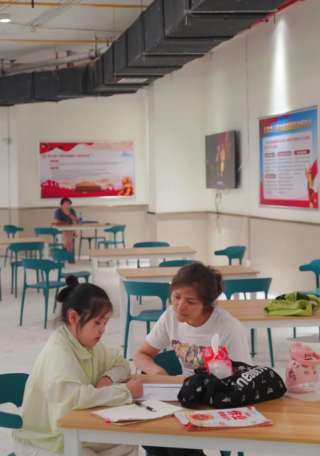 “家里老人睡得早,两个孩子在家怕吵着老人,就让他们来这边写作业了。” 吴女士笑着指了指儿子,“你看这孩子,昨天刷抖音刷到这儿,今天一吃完晚饭就催着来。这儿空间大、有 WiFi、电视机。写完作业还能看会儿电视,比家里自在多了。”