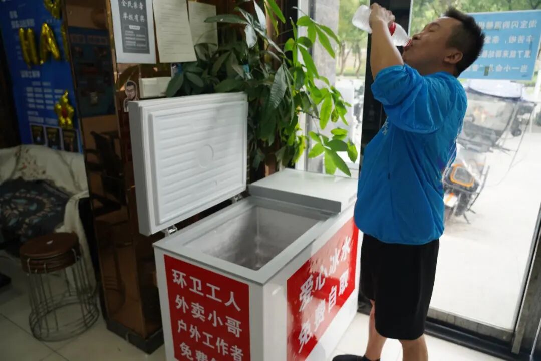 驿站的冰箱里,冰镇的矿泉水码得整整齐齐,旁边的爱心取水点贴着 “免费自取” 的字条。汉兴街道的工作人员说:“夏天户外工作者最辛苦,我们联合企业、工会一起搭这个驿站,就是想让他们随时能找到‘清凉港湾’。”