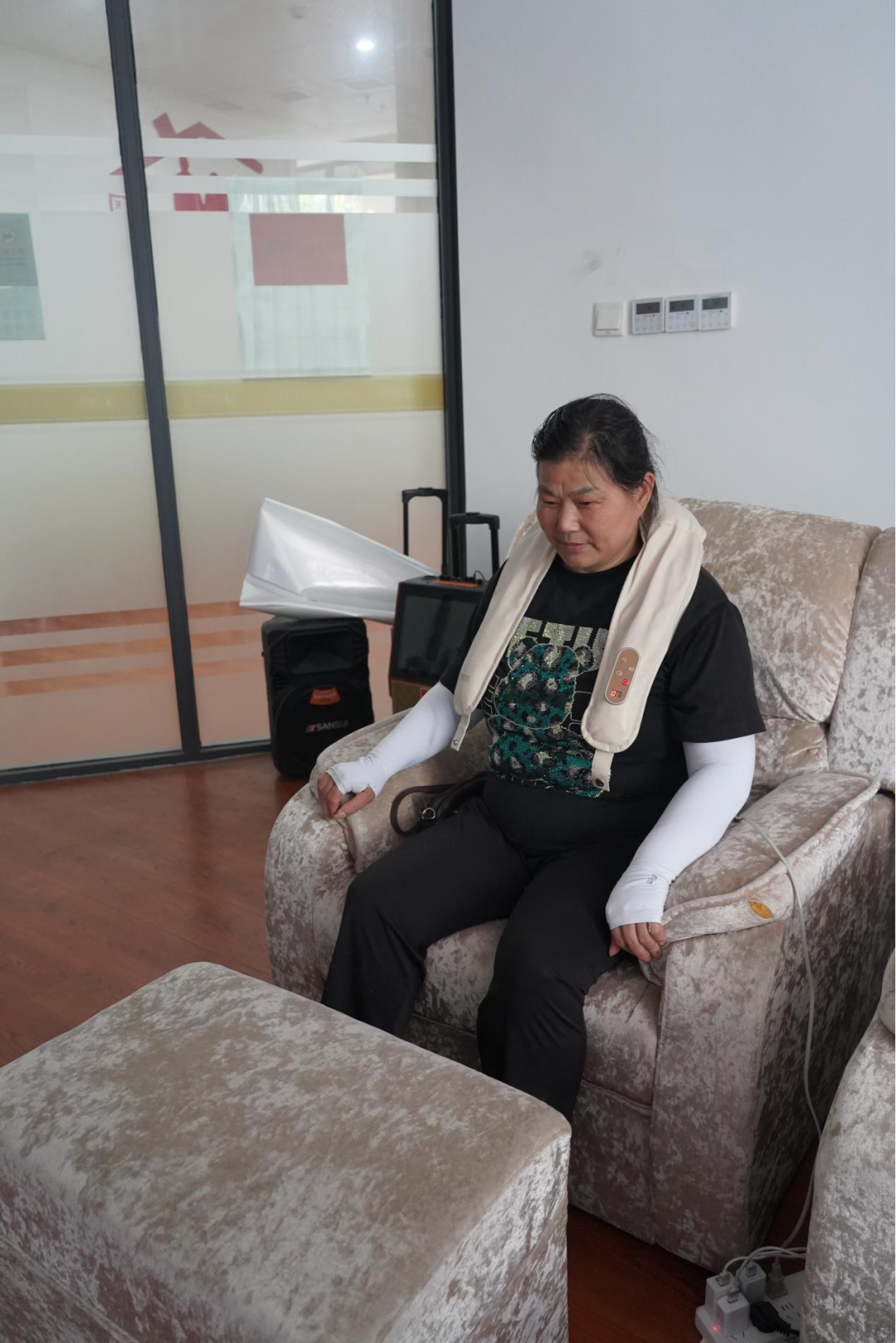花楼水塔街道的前进社区纳凉点,画风又不一样。刘婆婆正躺在按摩椅上,眯着眼睛哼着小曲,理疗程序结束,她直起身伸了个懒腰:“这椅子比家里的沙发还舒服!我和老街坊天天来,喝口绿豆汤,做个理疗,待着就不想走。”